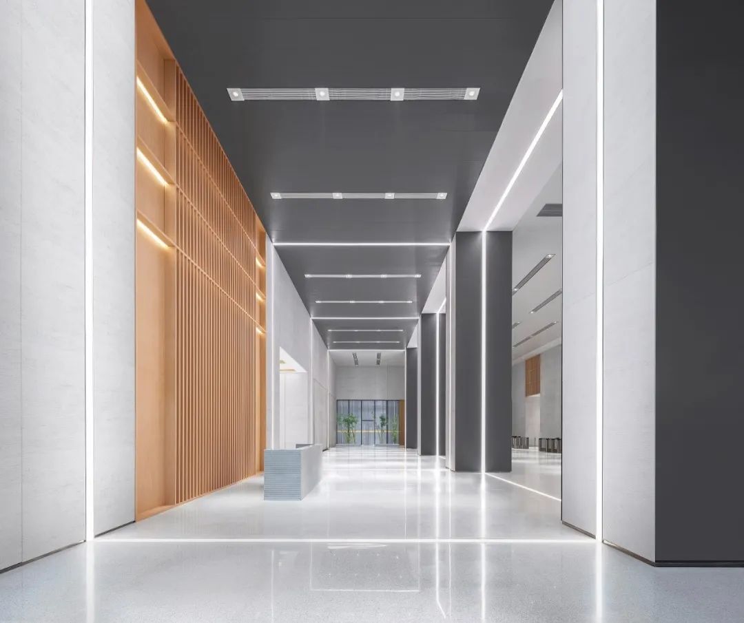 黑與白、縱與橫、冷與暖的強對比手法突破秩序維度,形成的反差給人提供直觀感受和聯(lián)想根據(jù),生出夸張的視覺效果和強烈的感染力,增加空間的層次與趣味性。線性的光切進空間,是為亮點,用光束的線性感描述空間結構,以空間表達光的形狀,將光與新古典建筑相融合。
