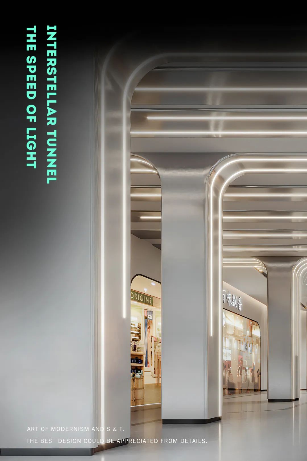 二層連廊區(qū)域是連接室內(nèi)和室外商業(yè)街的通道,金屬質(zhì)感貫穿其中,頂面流光的線條燈配合產(chǎn)生特殊效果,在兩個(gè)空間轉(zhuǎn)換有一種穿越時(shí)空的感覺(jué),配合門口特殊的科幻造型,在這里打造二層的網(wǎng)紅打卡點(diǎn)。