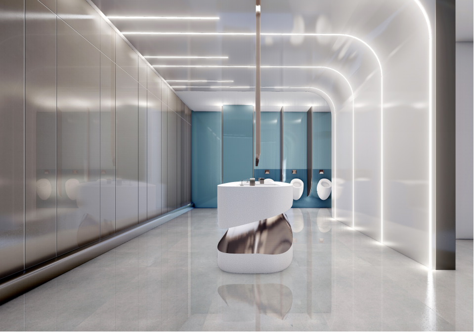 二層風(fēng)洞體驗(yàn)區(qū),結(jié)合風(fēng)洞設(shè)備本身的支撐柱,把風(fēng)洞做整體打造,柱子采用金屬質(zhì)感和線性燈條的設(shè)計(jì),加上本身風(fēng)洞的獨(dú)特體型,把風(fēng)洞區(qū)域完美融入到周圍的環(huán)境,成為這個(gè)區(qū)域最為炫酷的打卡點(diǎn),這同時(shí)也是未來(lái)科技城里最為閃亮的奇觀。