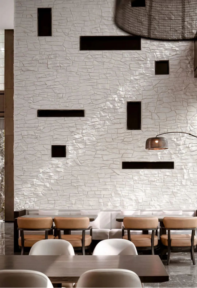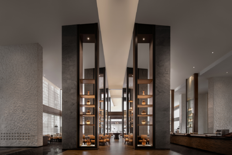 接待大堂江河設(shè)計(jì)JHD希望將故事從自然生態(tài)過(guò)渡到對(duì)于迷人的地域風(fēng)情。通過(guò)對(duì)當(dāng)?shù)氐某浞终{(diào)研,江河設(shè)計(jì)JHD保留了藏式迷人的色彩印象,用當(dāng)下工藝去詮釋藏式的邊瑪墻、融合極具天然質(zhì)感的薄石材板,同時(shí)將地域元素、文化進(jìn)行提煉整理點(diǎn)綴到空間中。同時(shí)創(chuàng)造性在首層接待大堂空間中置入畫(huà)廊,畫(huà)廊中的畫(huà)作均為藝術(shù)家為酒店創(chuàng)作的系列作品,將酒店的歷史風(fēng)貌及地域風(fēng)情展示出來(lái)。