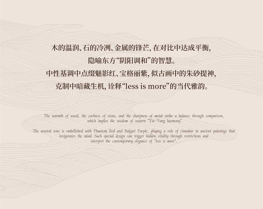 This project is aimed to satisfy people’s demands and desires of staying away from the hustle and bustle of modern urban life and listening to their inner heart. To be specific, "elegance" is hidden in details, and "luxury" is hidden in restraint in this design, which also, by taking "people" as a scale, transforms the cultural symbols into perceptible living scenes.