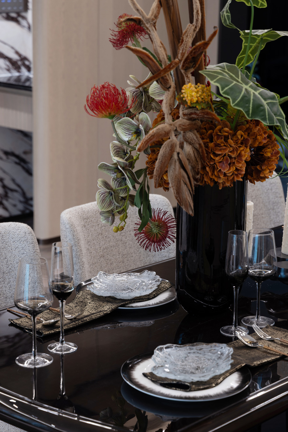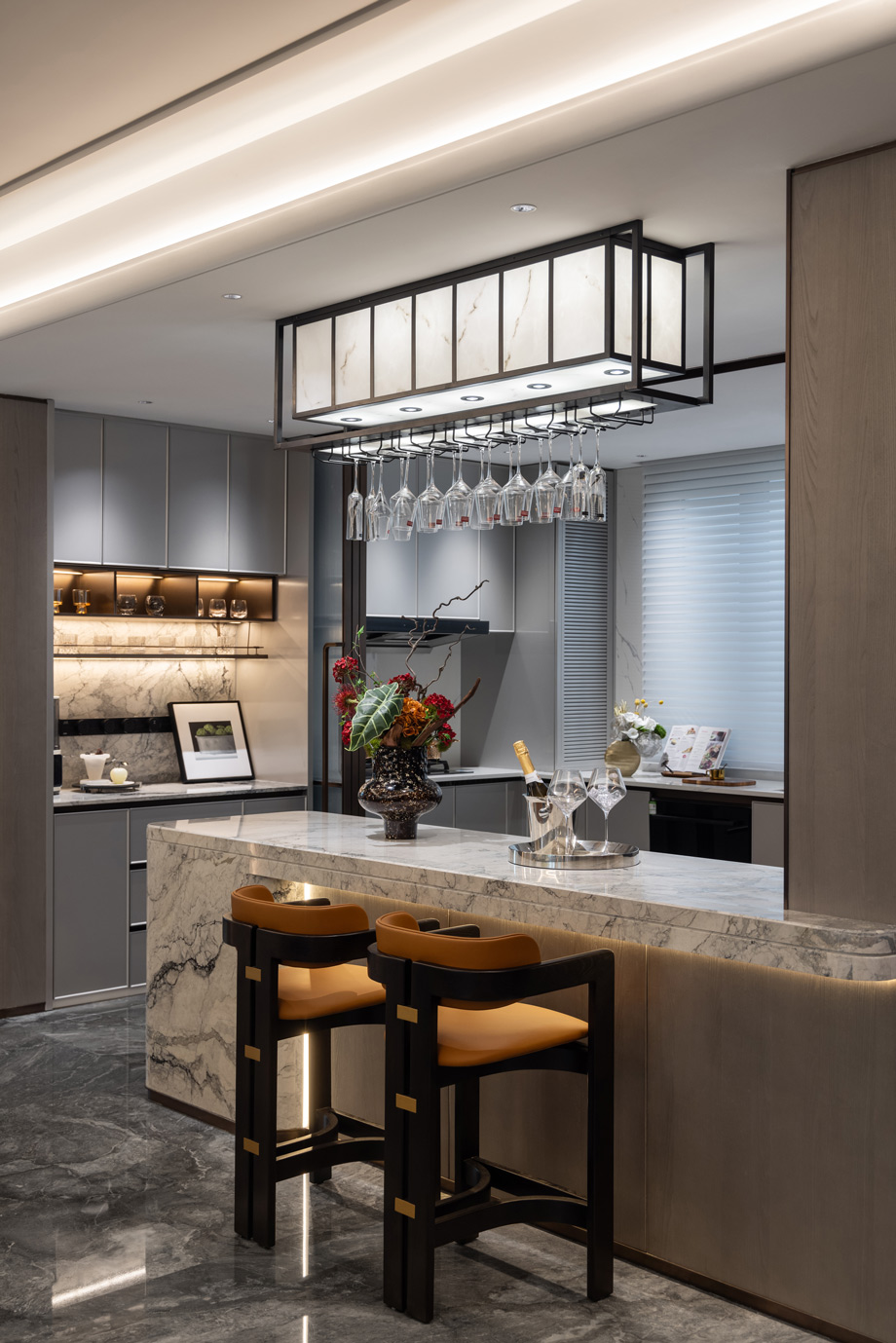 LDK一體化設(shè)計(jì)打破界限,范特西石材通鋪地面如流動(dòng)的琴鍵,串聯(lián)起西廚島臺(tái)的煙雨江南奢石、客廳壁爐的暖意,與餐桌上的琉璃器皿。