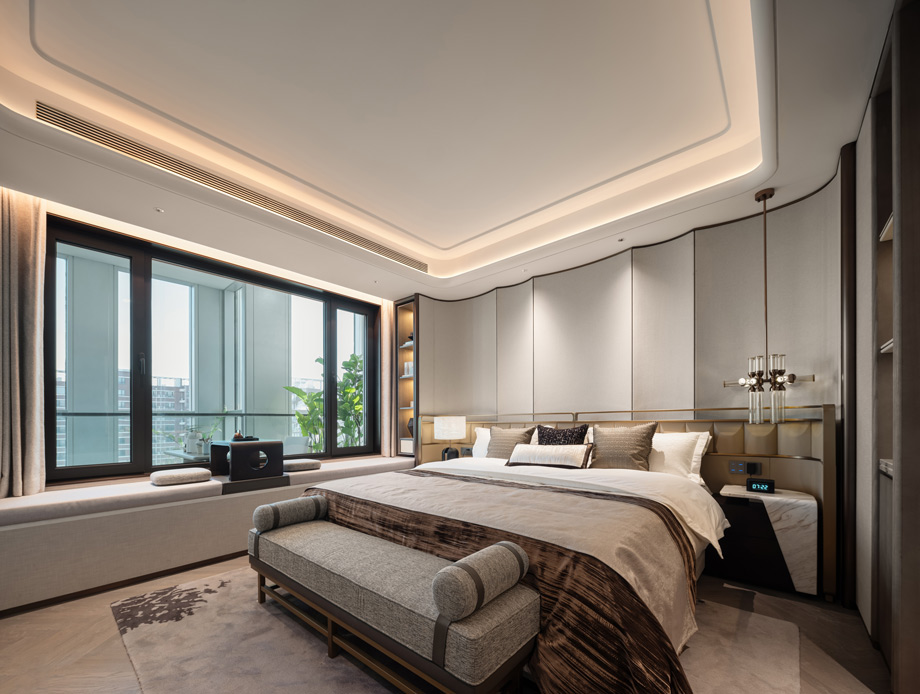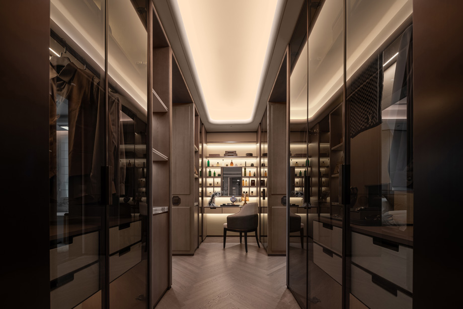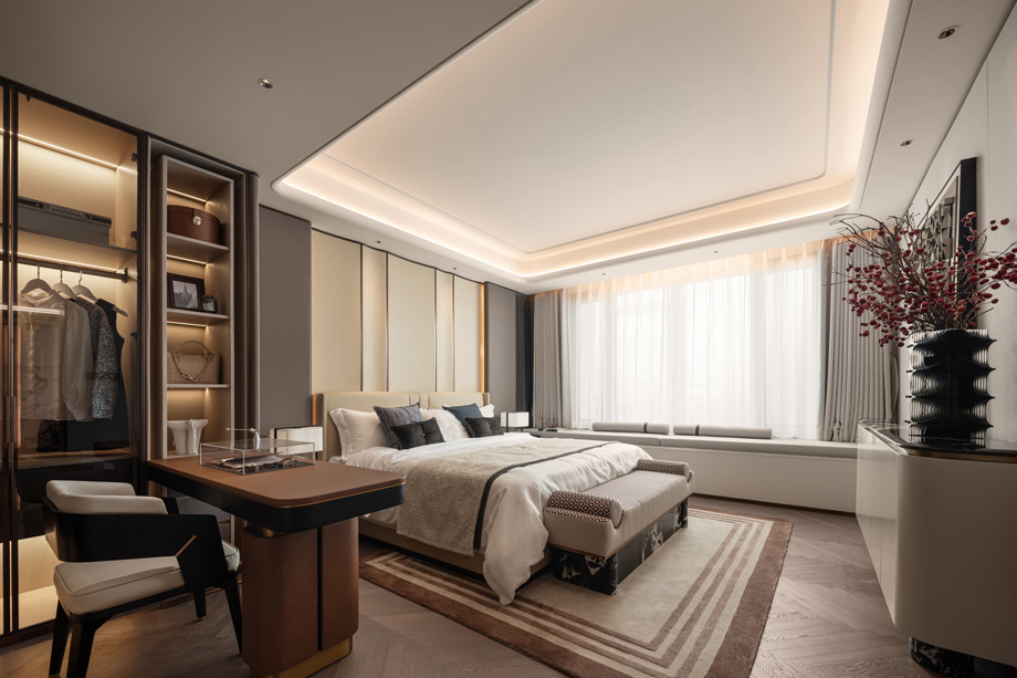 The master bedroom comes with a walk-in closet. The space extension not only enhances the sense of nobility and rituality of the master but also strikes a balance between aesthetics and practicality; wood veneer, glass, and leather materials as well as warm light together foster the sense of luxury and luxury.