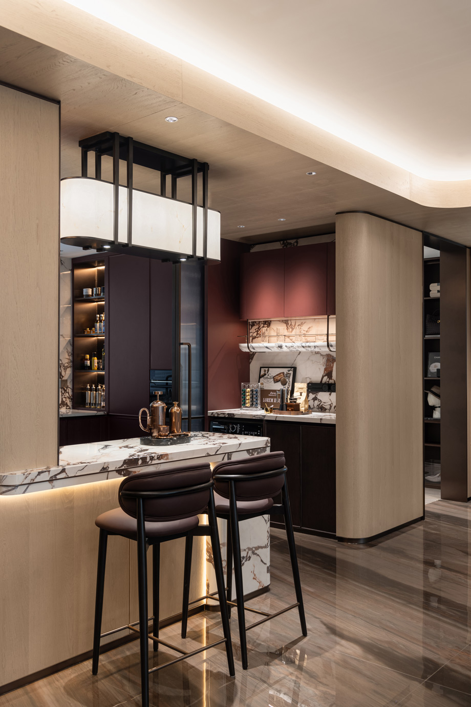 The U-shaped kitchen is furnished with the Phantom red cabinet. The design of dark wood grain can be imaged as flames at night. Bulgari stone platform can be imaged as a galaxy. High-end kitchen appliances are hidden inside the cabinet, realizing a perfect harmony between functions and aesthetics.