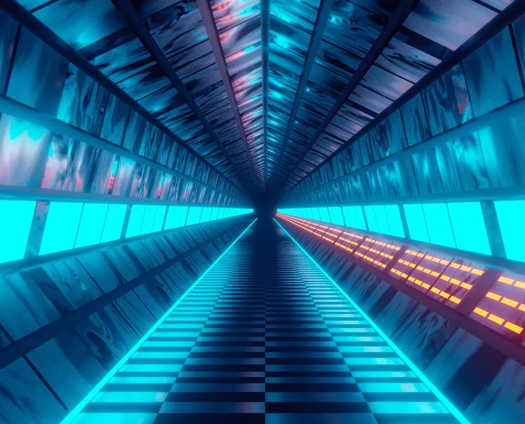 The application of mirror, light reflection and extension effect and a ring aisle finally create a large and closed time tunnel. Such a special design way enables people traveling through there to experience a virtual world and the special charm of electronic sports.