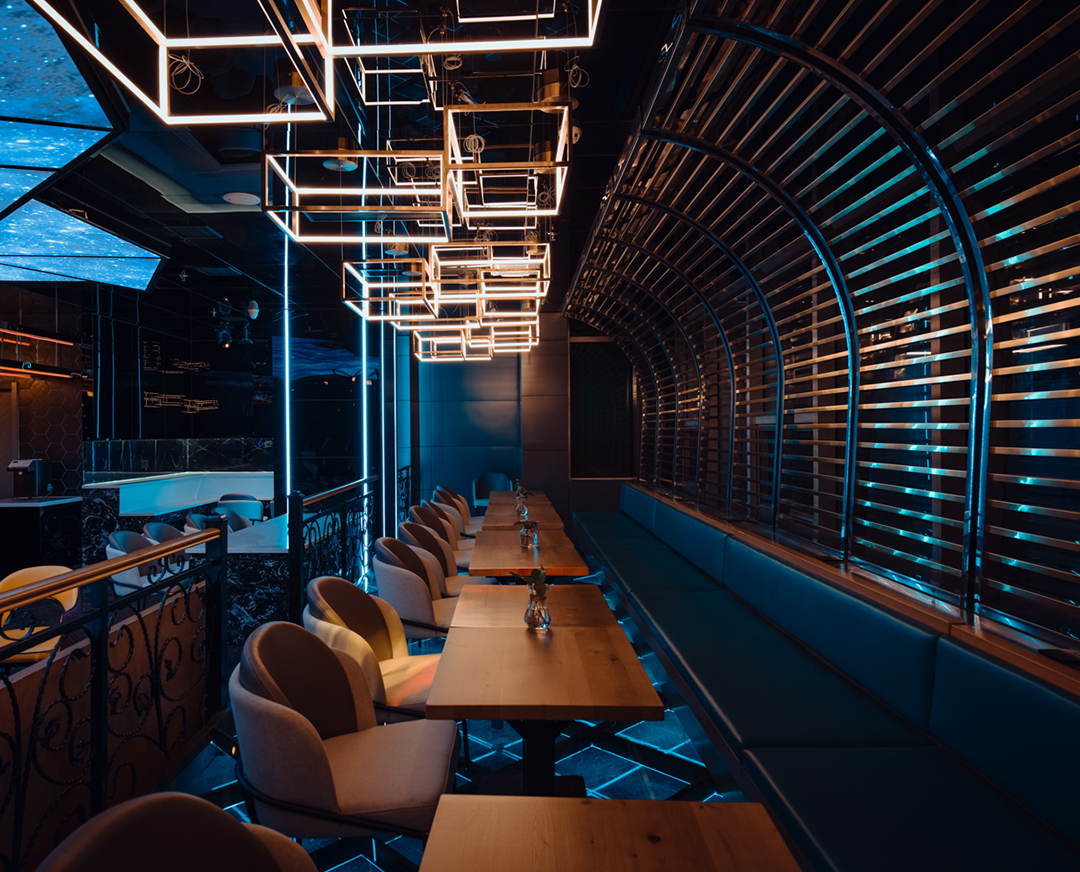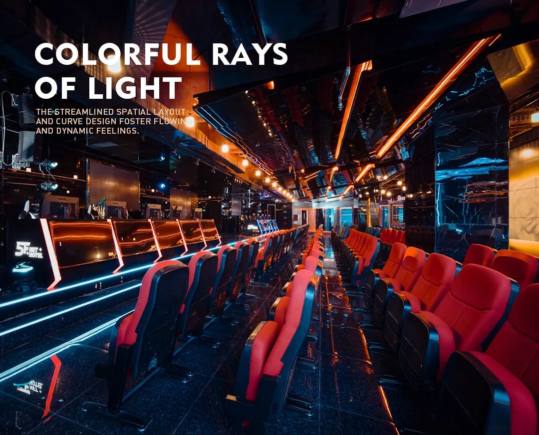 The streamlined spatial layout and curve design foster flowing and dynamic feelings. Atmosphere full of vigor and passion is created by taking advantage of bright colors and lights. The final design effect is different from routine art representation form and brings new sense judgment and special visual experience of colorful rays of light.