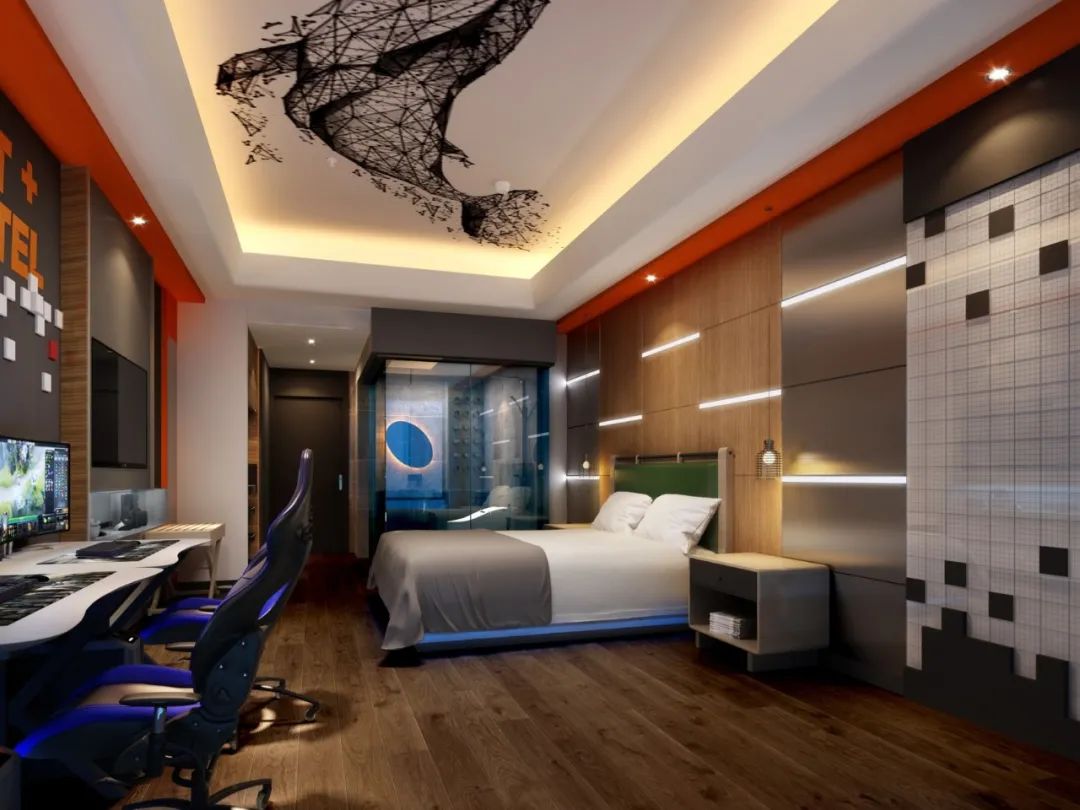 The hotel with special space temperature is mainly designed with a black color, to create deep, cool, swift and fierce atmosphere. The unique design technique brings e-sports fans a special and true illusory space.