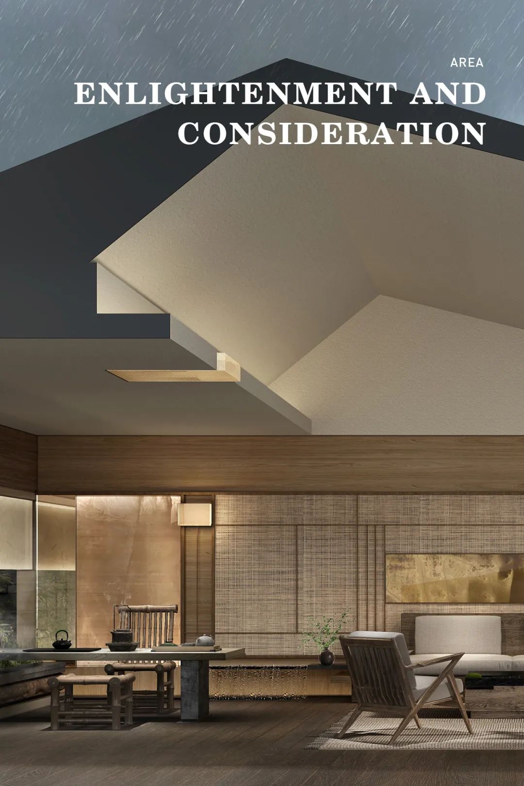 The lobby is designed in a silent way, which could guide people to think about the significance of life. The ancient wall decoration on wall seems like rolling water that triggers people’s thinking. It is a hermit that is asking his inner heart. The design is not only a space but a place that enlightens the inner feelings.